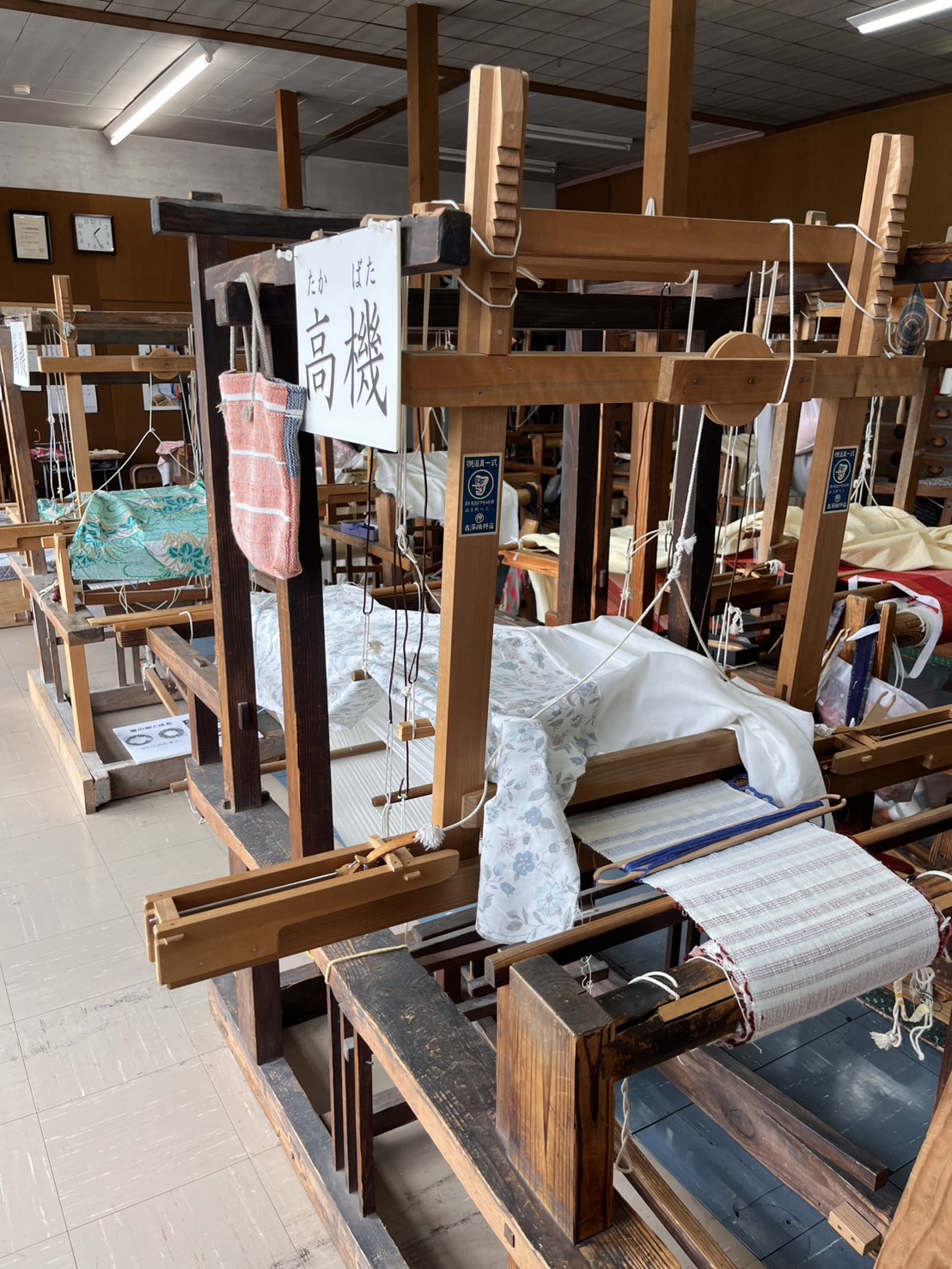 はたおりの部屋には多くの高機が並び、毎週水曜日と金曜日には、ボランティアの方による実演や解説が10時から15時まで行われています。