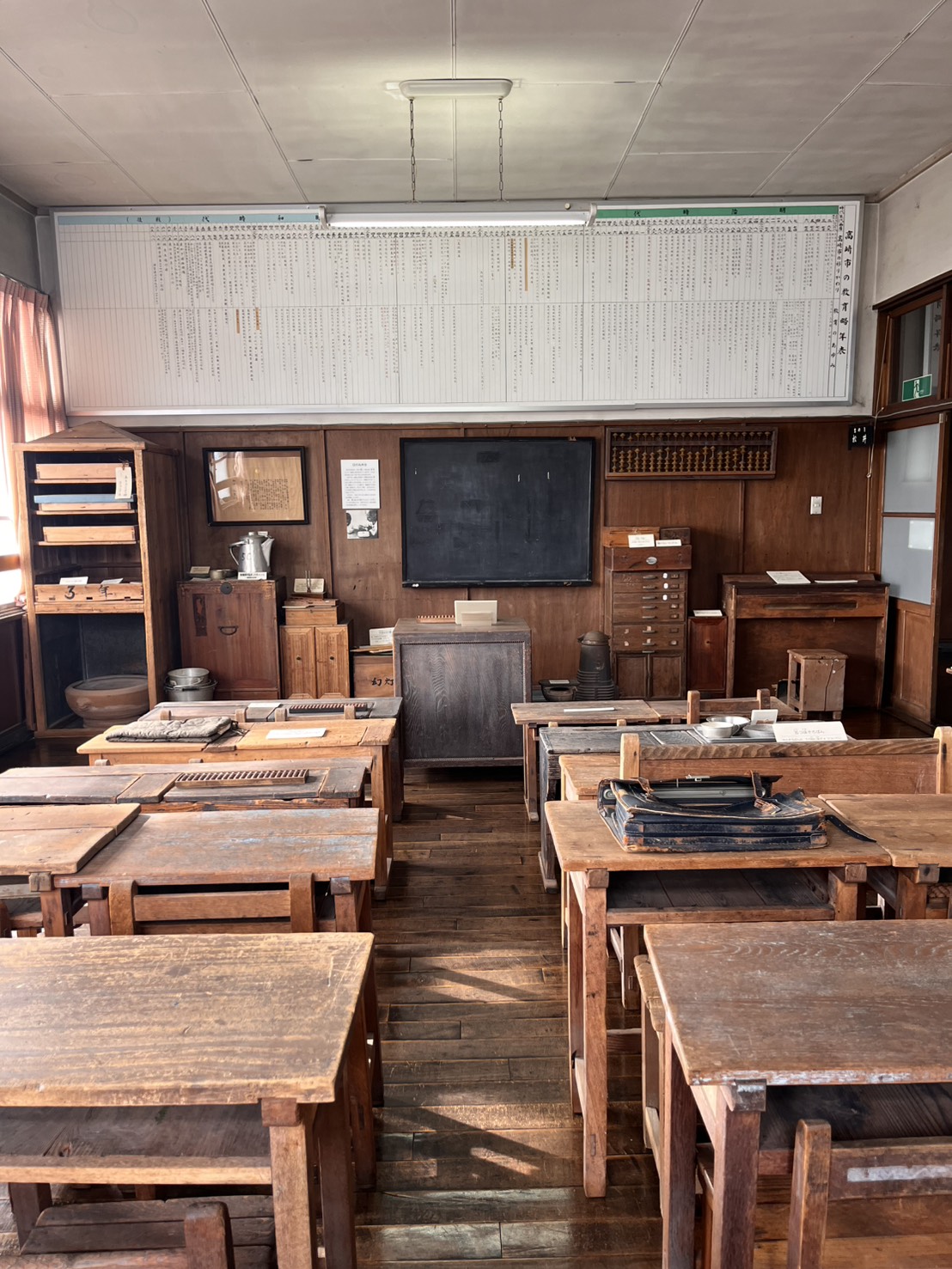 また、昔の教室を再現した部屋では、当時の机や椅子、そろばん、木銃などが並び、戦時中の教育現場の様子をリアルに感じることができました。