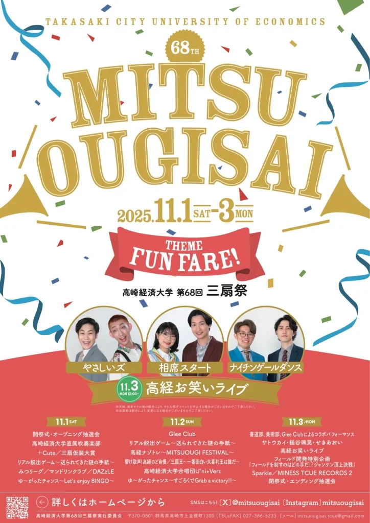 三扇祭(みつおうぎさい)は、今年で68回目を迎える高崎経済大学の大学祭です。