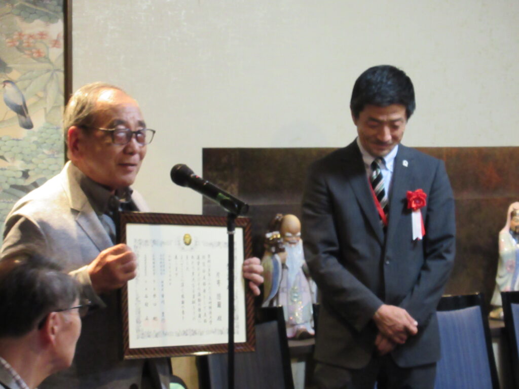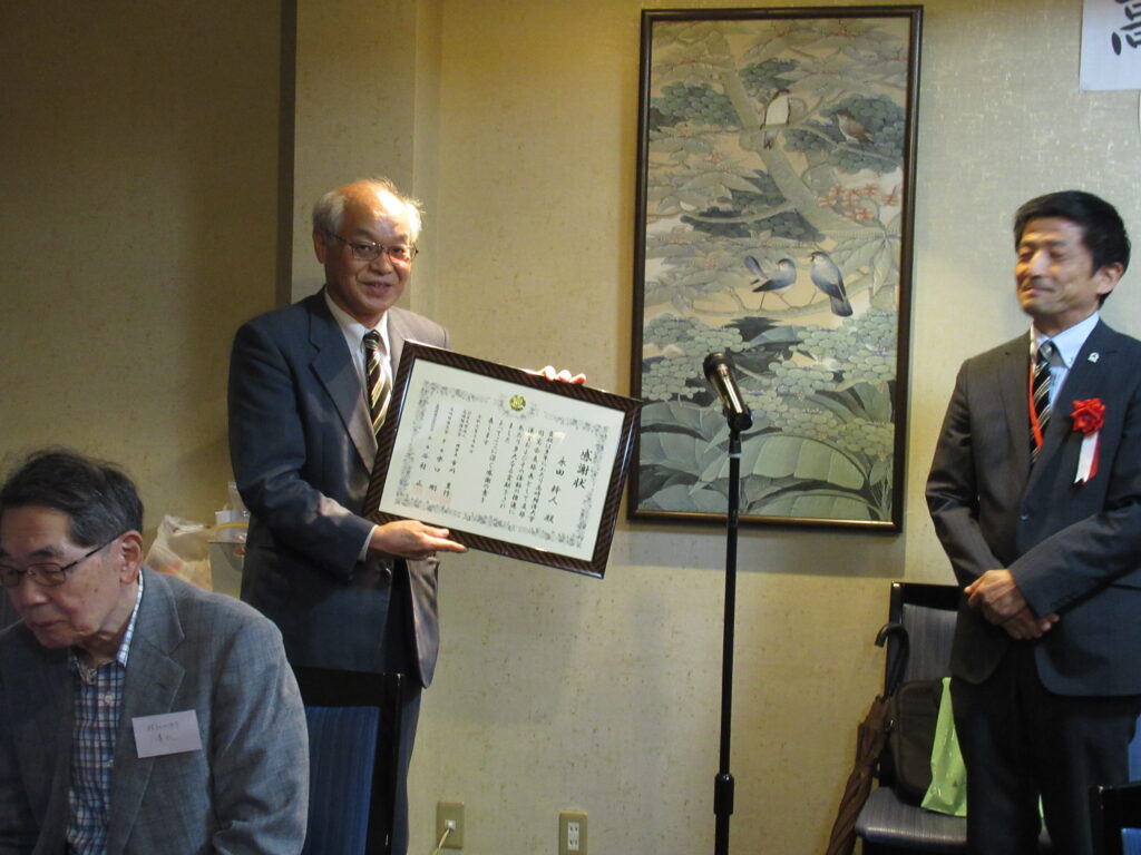 続いて、歴代支部長に感謝状の贈呈がありました。同窓会江畑副会長より4人の歴代支部長に贈呈されました。西田宏さん、桑田幸一さん、片寄悠爾さん、永田幹人さん、大変お世話になりました。今後ともよろしくお願いいたします。