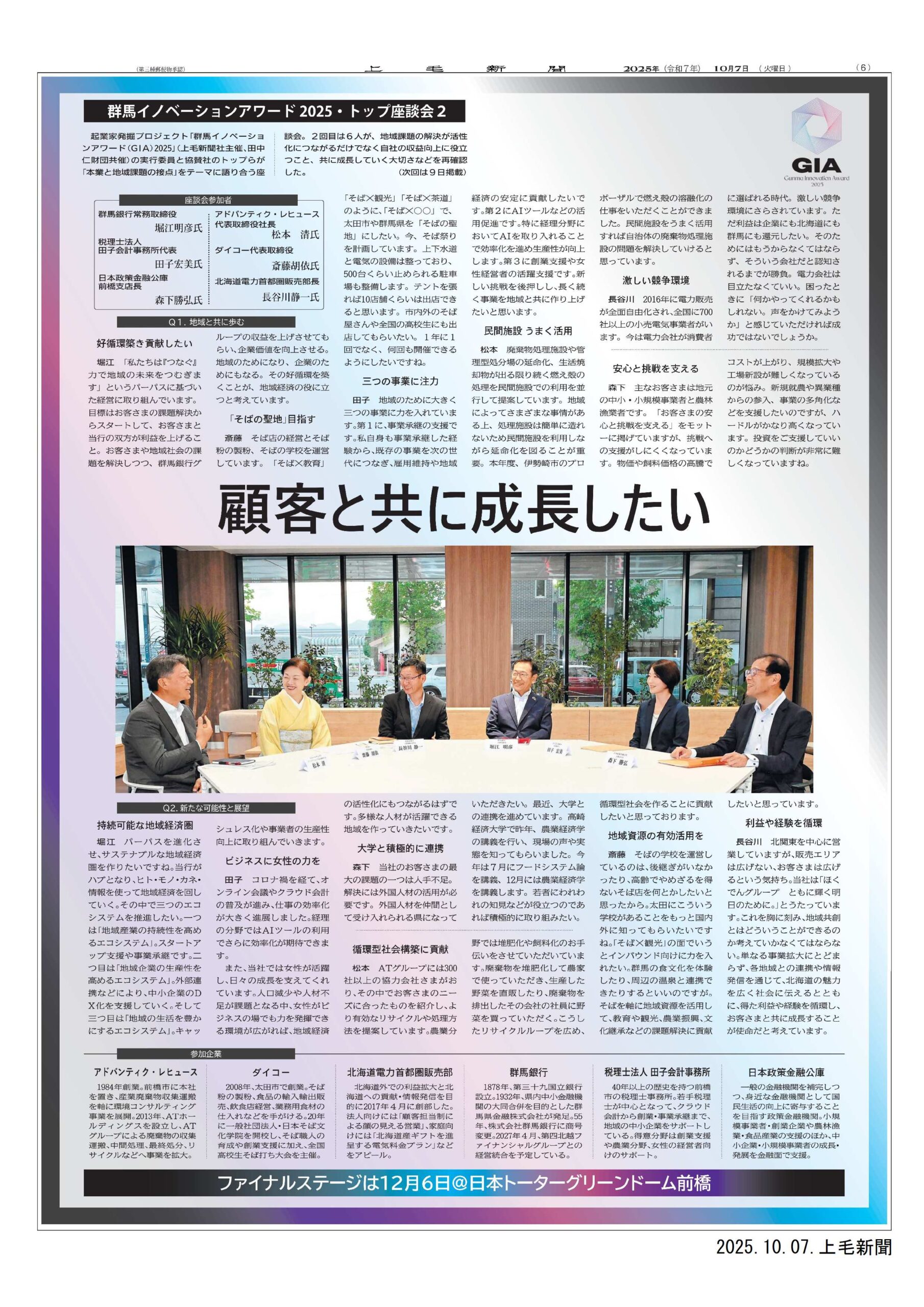 起業家発掘プロジェクト「GIA(群馬イノベーションアワード)2025」トップ座談会に、同窓生の長谷川 静一 氏(H5卒:ラグビー部)が協賛会社の一人として参加した様子が上毛新聞に掲載されました