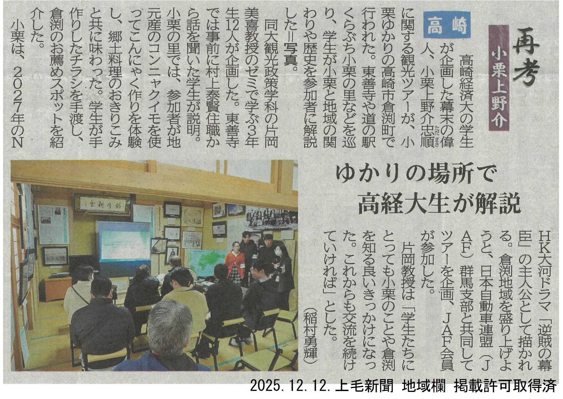 2027年の大河ドラマ主人公に決定している幕末の偉人、小栗上野介に関する観光ツアーを、高崎経済大学の片岡ゼミ学生が企画・開催しました